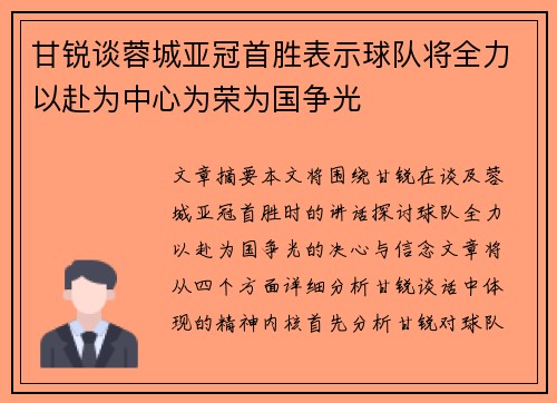 本文围绕以塞鸟在备战足协杯决赛前所作的强调与动员展开,从球队备战状态、技战术调整、团队凝聚力建设以及球迷助威力量四大方面进行细致阐述。文章首先以约300字的摘要,对整篇内容进行统摄性的概括,强调以塞鸟所传递的核心精神:保持最佳竞技状态、科学备战、团队齐心、球迷共行。随后在正文部分,通过逻辑清晰、层层递进的论述,展现球队面对决赛前所做的心理准备、战术布局与状态管理,同时描绘球队内部如何通过沟通和信任...